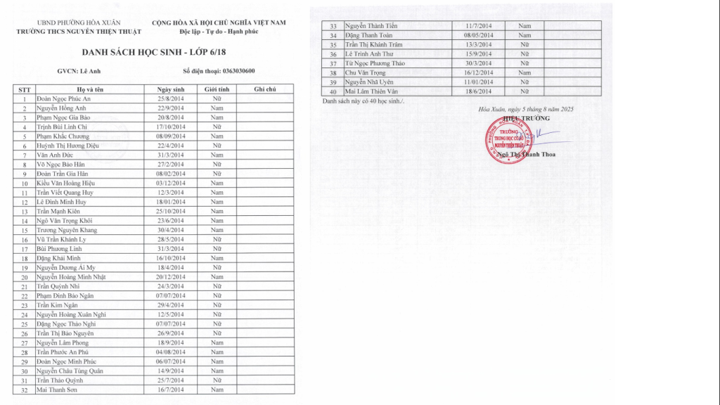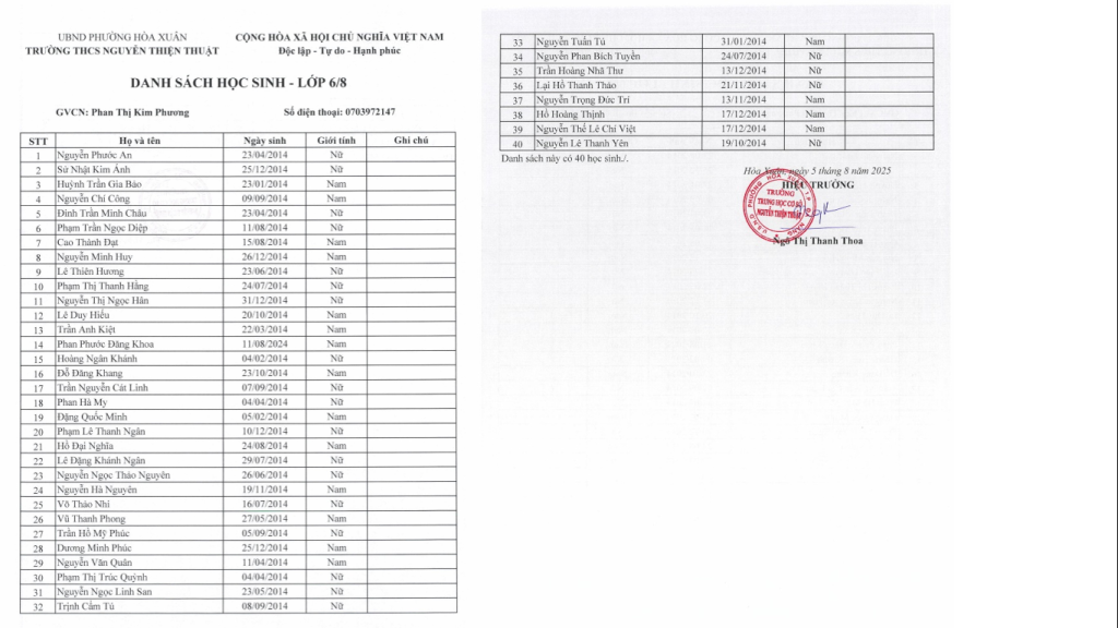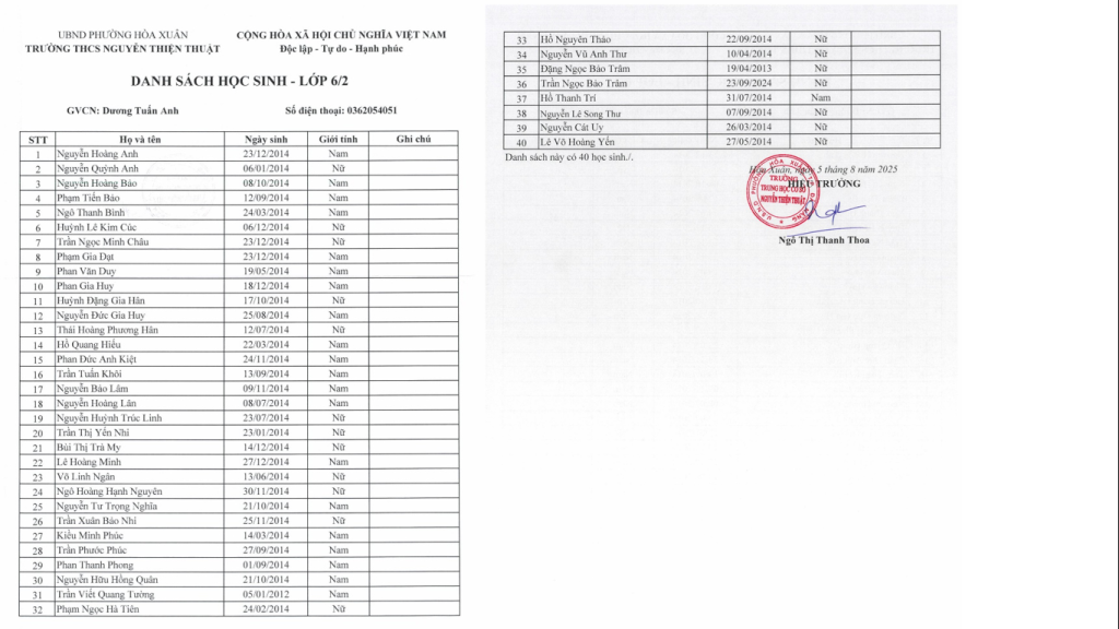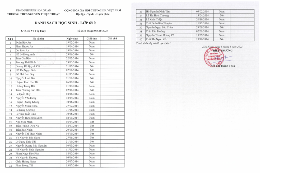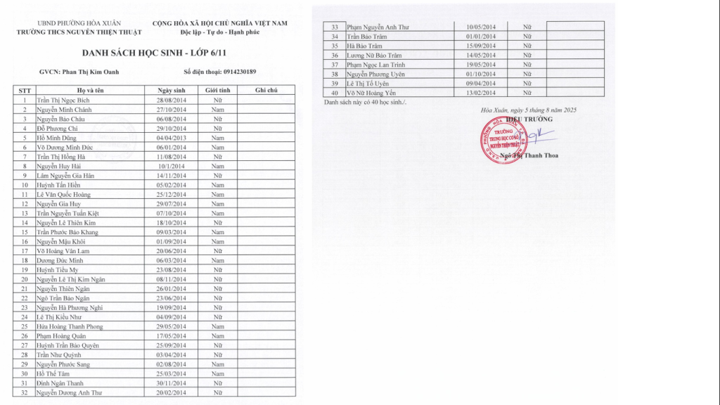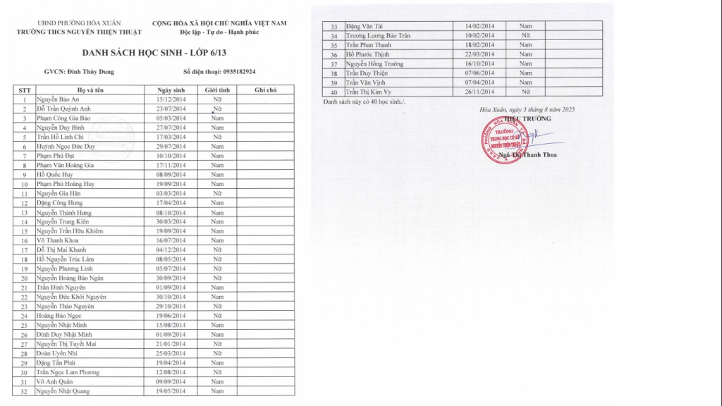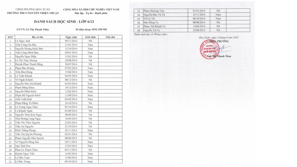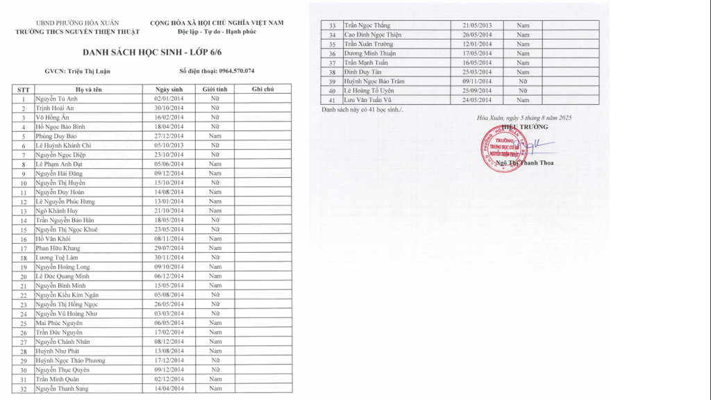 Dưới đây là danh sách học sinh trúng tuyển lớp 6 – Năm học 2025-2026