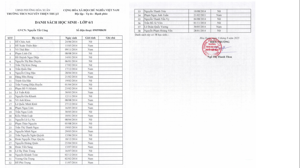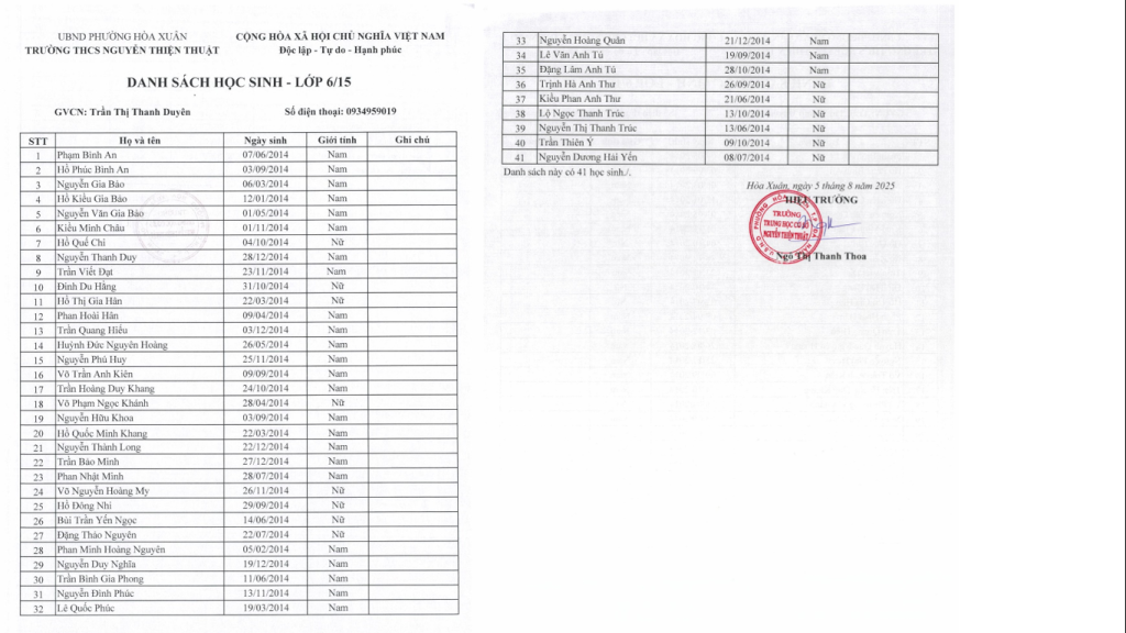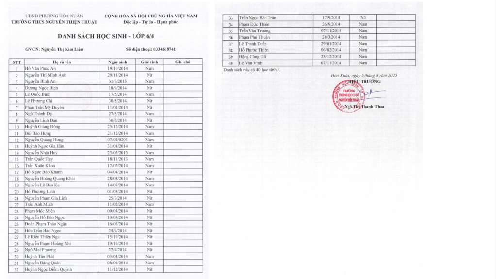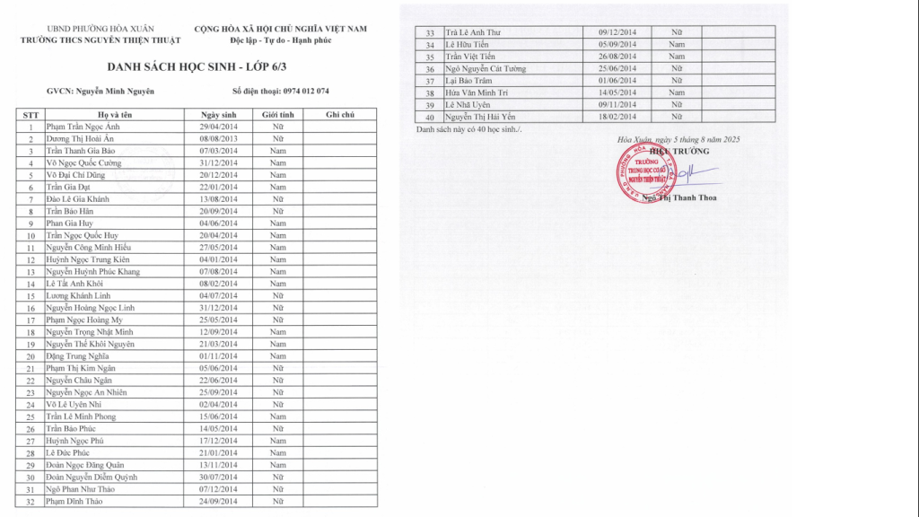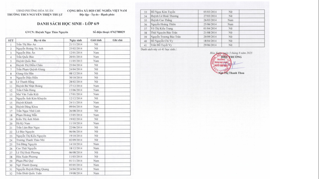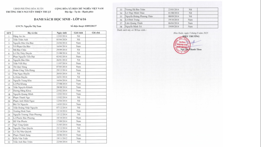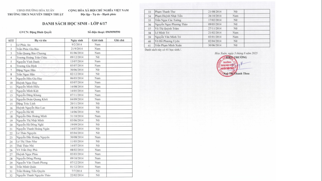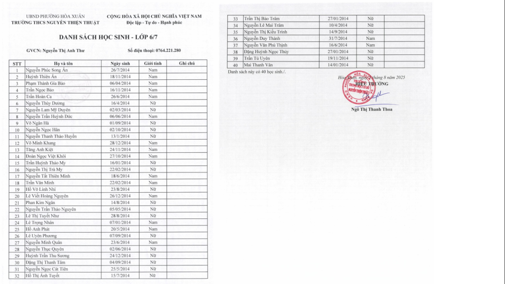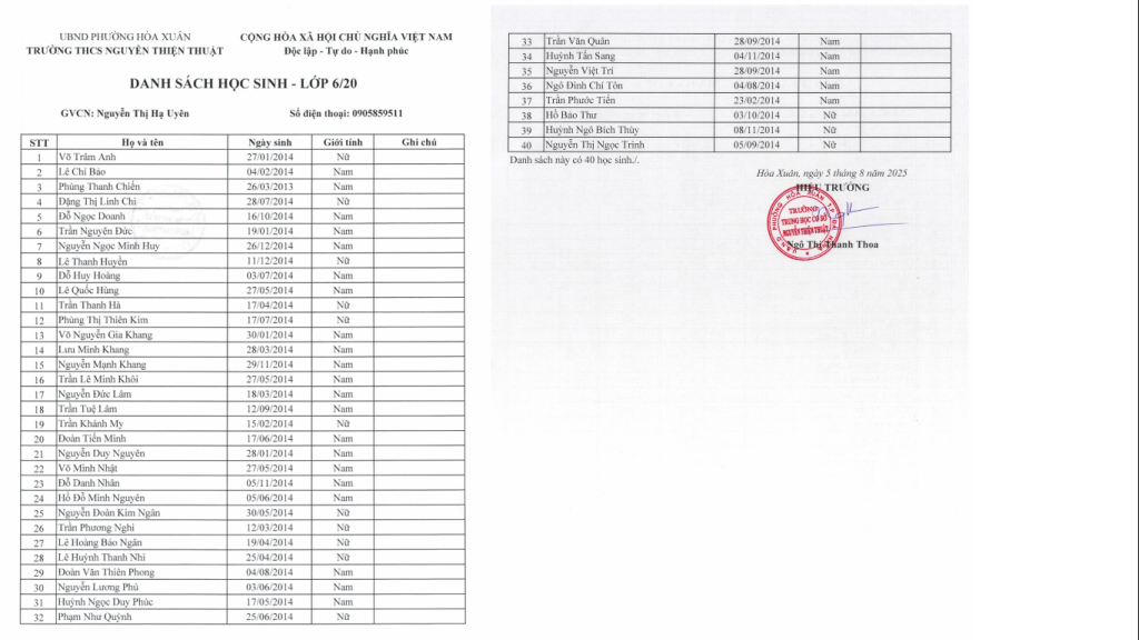 Dưới đây là danh sách học sinh trúng tuyển lớp 6 – Năm học 2025-2026