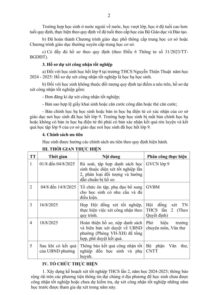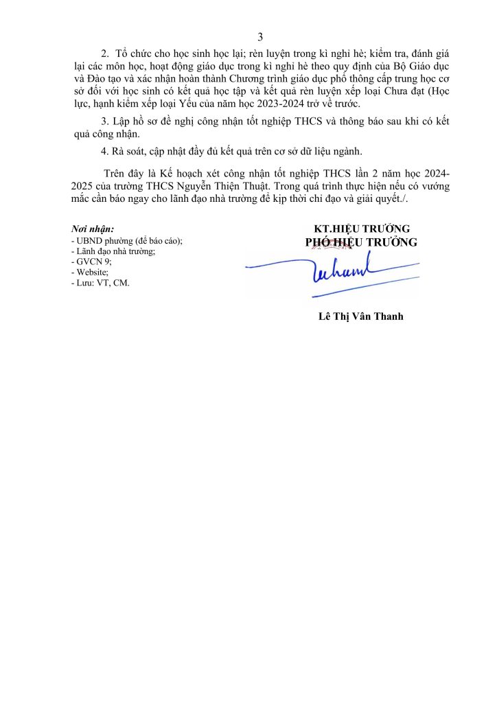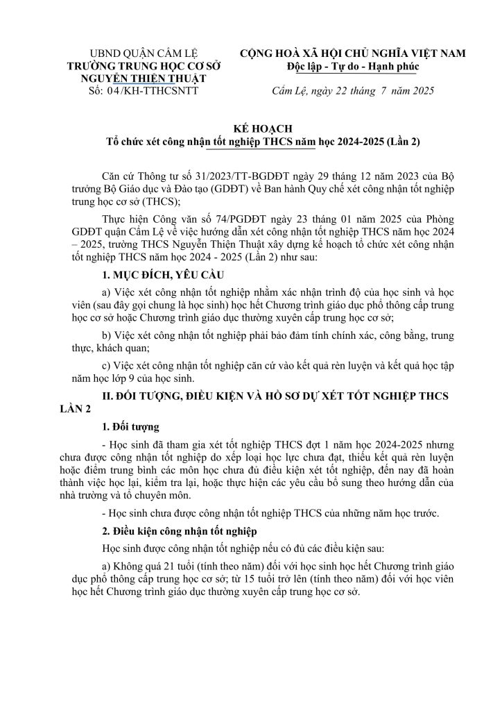 KẾ HOẠCH: Tổ chức xét công nhận tốt nghiệp THCS năm học 2024-2025 (Lần 2)