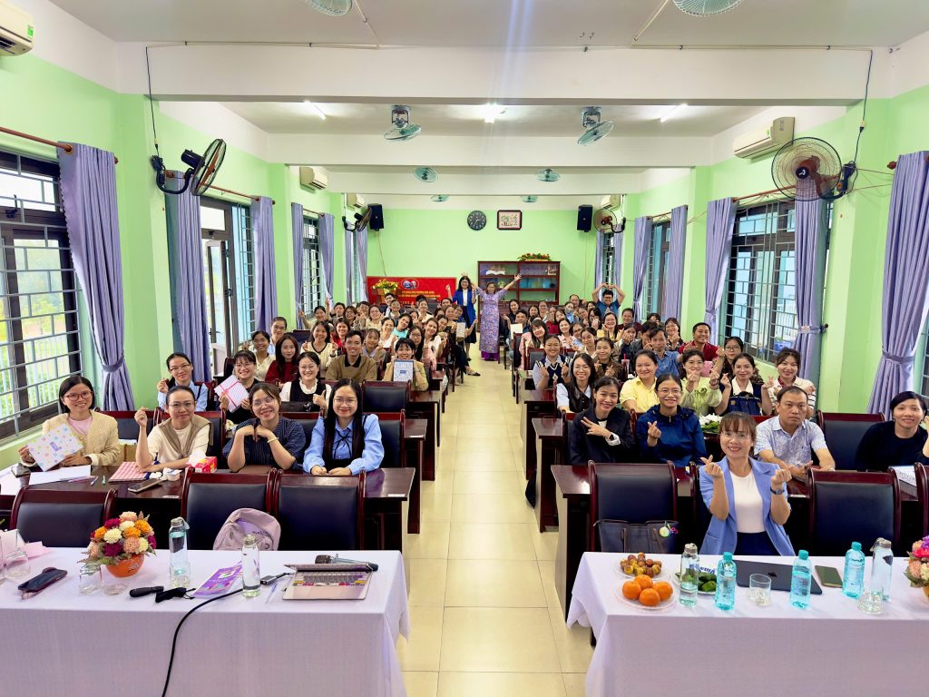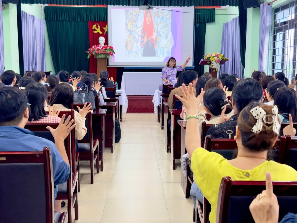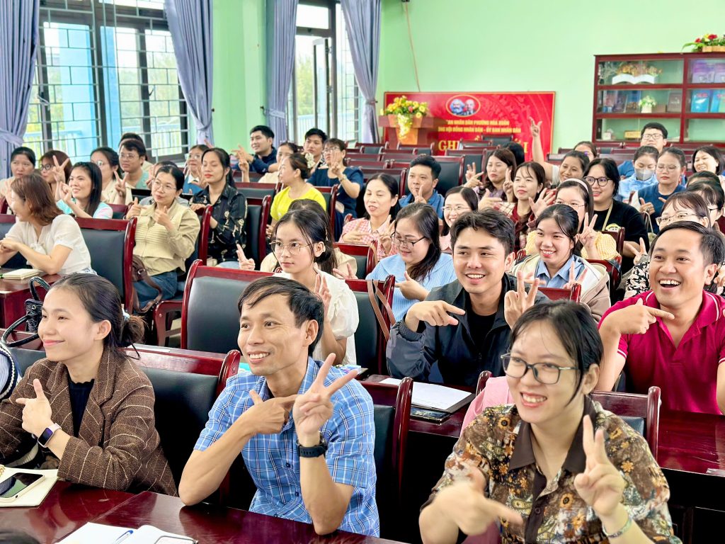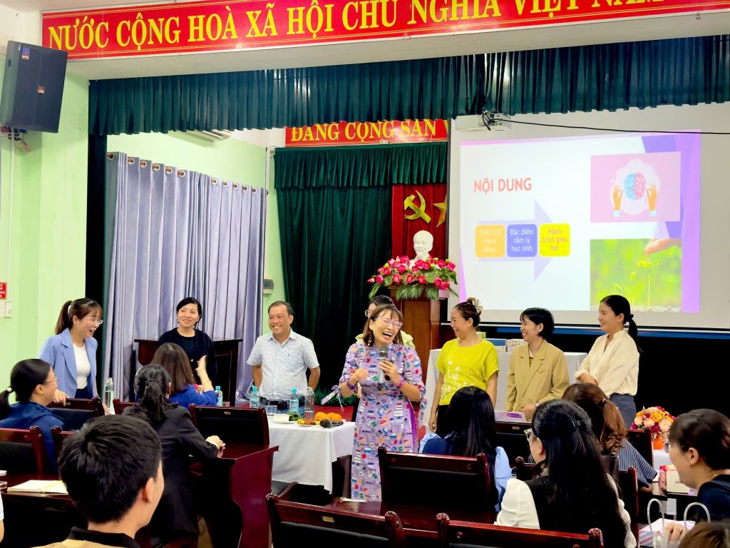 Khép lại chuỗi chuyên đề là “Hành trình gieo hạt” – phần nội dung đọng lại nhiều cảm xúc nhất. Báo cáo viên dẫn dắt bằng những nghiên cứu khoa học, cho thấy tác động mạnh mẽ của lời nói, thái độ và cảm xúc tích cực trong việc nuôi dưỡng tâm hồn con người. Thông điệp được gửi gắm giản dị mà sâu sắc: hãy bắt đầu từ chính mình, hãy gieo những hạt giống tốt lành bằng yêu thương và niềm tin mỗi ngày. Xen kẽ chương trình là các hoạt động tương tác, chia sẻ kinh nghiệm sôi nổi cùng những phần quà trao tay, đã tạo nên không khí ấm áp, gần gũi. Qua buổi tập huấn, mỗi giáo viên đều thêm vững tin và được truyền năng lượng tích cực để tiếp tục giữ ngọn lửa đam mê, lan tỏa yêu thương, cùng nhau xây dựng một môi trường học đường hạnh phúc và nhân ái.