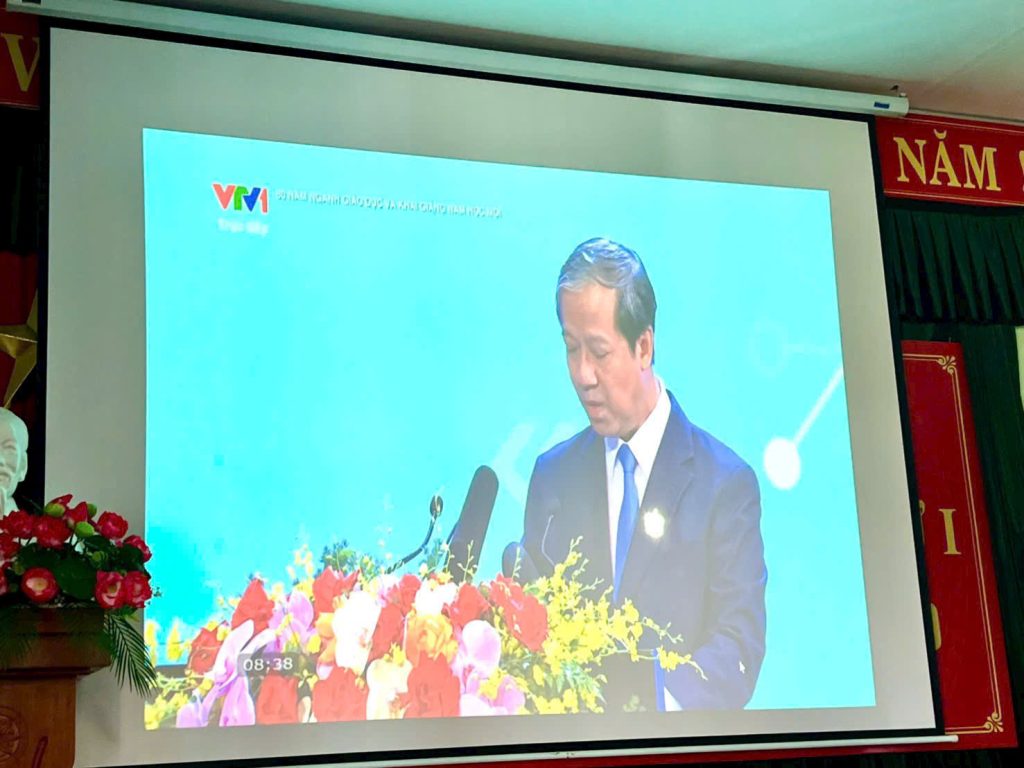 Trong phần tuyên bố lý do và giới thiệu đại biểu, thay mặt Ban Tổ chức, thầy Lê Ngọc Vũ – Phó hiệu trưởng HĐNGLL đã khẳng định: lễ khai giảng năm học 2025 – 2026 được tổ chức trong bối cảnh toàn ngành giáo dục cả nước hân hoan kỷ niệm 80 năm Cách mạng Tháng Tám và Quốc khánh 2/9. Đây không chỉ là ngày hội “Toàn dân đưa trẻ đến trường”, mà còn là dịp để thầy và trò cùng hòa nhịp trong hành trình 80 năm vẻ vang của nền giáo dục Việt Nam.