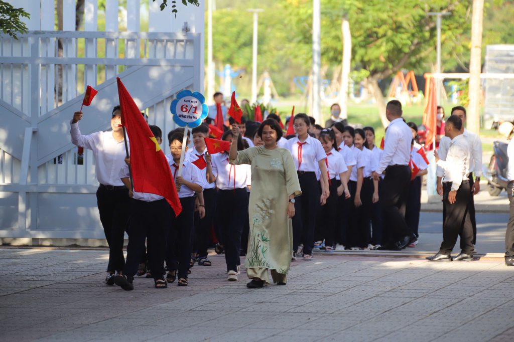 Tiếp đó, toàn thể đại biểu, thầy cô và học sinh trang nghiêm trong nghi thức chào cờ. Tiếng Quốc ca ngân vang giữa bầu trời tháng Chín như lời nhắc nhở thế hệ hôm nay về trách nhiệm giữ gìn và phát huy truyền thống dân tộc.